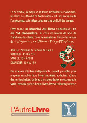 En décembre, la magie et la féérie s’installent à Plombières-les-Bains. Le « Marché de Noël d’antan » est sans aucun doute l’un des plus authentiques des marchés de Noël des Vosges. Cette année, un Marché du livre s’installera du 12 au 14 décembre, au cœur de Marché de Noël de Plombières-les-Bains, dans la magnifique bâtisse historique de l’Empereur, sa Femme et le petit Prince.