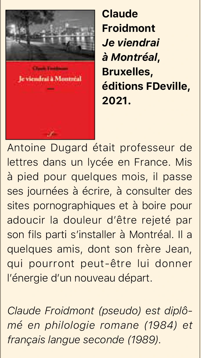 Antoine Dugard était professeur de lettres dans un lycée en France. Mis à pied pour quelques mois, il passe ses journées à écrire, à consulter des sites pornographiques et à boire pour adoucir la douleur d’être rejeté par son fils parti s’installer à Montréal. Il a quelques amis, dont son frère Jean, qui pourront peut-être lui donner l’énergie d’un nouveau départ.